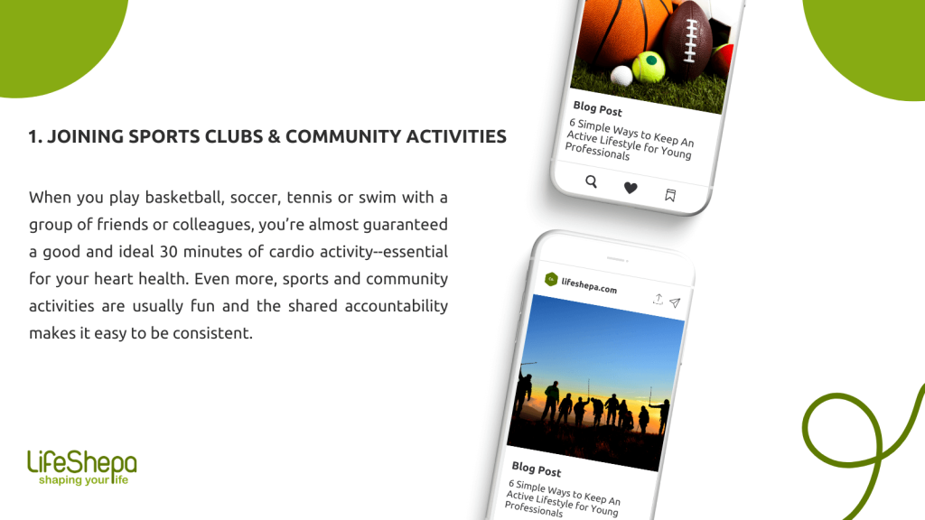 When you play basketball, soccer, tennis or swim with a group of friends or colleagues, you’re almost guaranteed a good and ideal 30 minutes of cardio activity; essential for your heart health. Even more, sports and community activities are usually fun and the shared accountability makes it easy to be consistent.