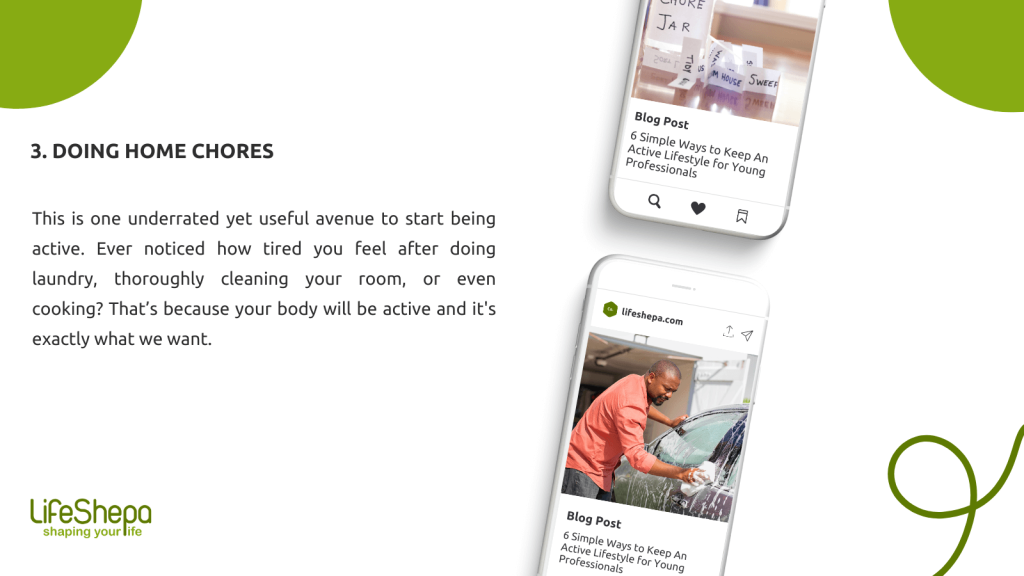 This is one underrated yet useful avenue to start being active. Ever noticed how tired you feel after doing laundry, thoroughly cleaning your room, or even cooking? That’s because your body will be active and it’s exactly what we want.
